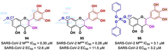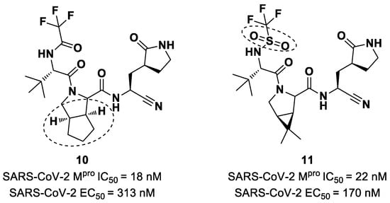 Starting from Nirmatrelvir, Zhu et al. developed a series of novel SARS-CoV-2 Mpro inhibitors by optimizing the P2 and P4 positions of the peptide framework [34]. Within this series, compounds 10 and 11 (Figure 8) exhibited optimal inhibitory activity toward SARS-CoV-2 Mpro, with IC50 values of 18 nM and 22 nM, respectively. Compound 10 derived from an optimization study of the P2 site in which the dimethyl-bicycloproline of Nirmatrelvir was replaced with a cyclopentenyl proline. Compound 11 derived from an optimization attempt of the P4 site with the aim of improving the metabolic stability. In particular, the trifluoromethyl group of Nirmatrelvir was replaced with a trifluoromethanesulfonyl group. Compounds 10 and 11 exhibited higher antiviral activity than Nirmatrelvir against SARS-CoV-2-infected VeroE6 cells, with EC50 values of 313 nM and 170 nM, respectively. They also exhibited better metabolic stability than Nirmatrelvir and similar PK properties [34].