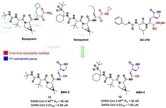 Inspired by the structures of hepatitis C virus NS3/4A serine protease inhibitors Narlaprevir and Boceprevir, and SARS-CoV Mpro inhibitors such as GC-376 (Figure 9), Kneller et al. developed three SARS-CoV-2 Mpro inhibitors bearing a nitrile warhead [35]. Compounds 12 and 13 (the two most active derivatives), called BBH-2 and NBH-2, respectively (Figure 9), were designed by replacing the C-terminal di-ketoamide group of Boceprevir and Narlaprevir, respectively, with a nitrile warhead, whereas the hydrophobic P1 groups present in the serine protease inhibitors were replaced in both derivatives with a γ-lactam ring as per GC-376.
