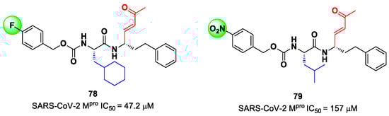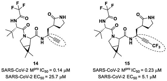 Brewitz et al. developed different Nirmatrelvir derivatives by accomplishing the isoelectronic replacement nitrile/alkyne group [36]. The most promising compounds of this series turned out to be the alkyne derivate 14 and the CF3-capped alkyne 15 (Figure 11). They displayed noteworthy SARS-CoV-2 Mpro inhibitory and antiviral activity, high selectivity (no activity against SARS-CoV-2 PLpro) and a low cytotoxicity profile. MS analyses and crystallographic studies demonstrated that, unlike nitrile derivates that inhibit Mpro in a reversable manner, these alkyne derivatives inhibit Mpro by an apparent irreversible covalent mechanism, forming an internal vinyl thioether adduct with the Cys145 residue [37].