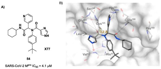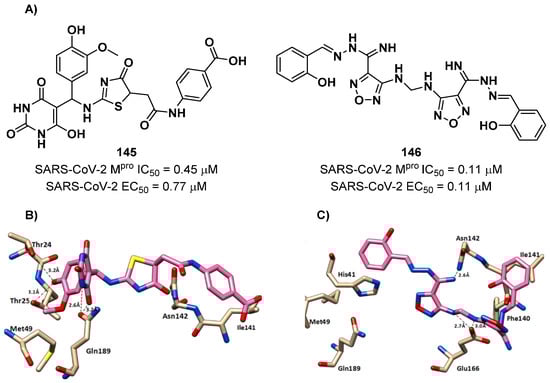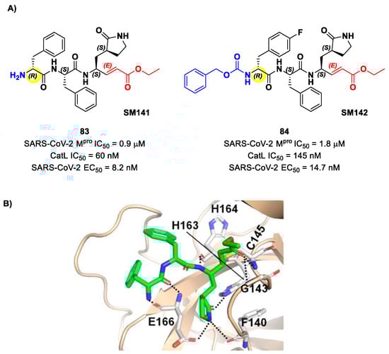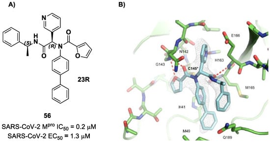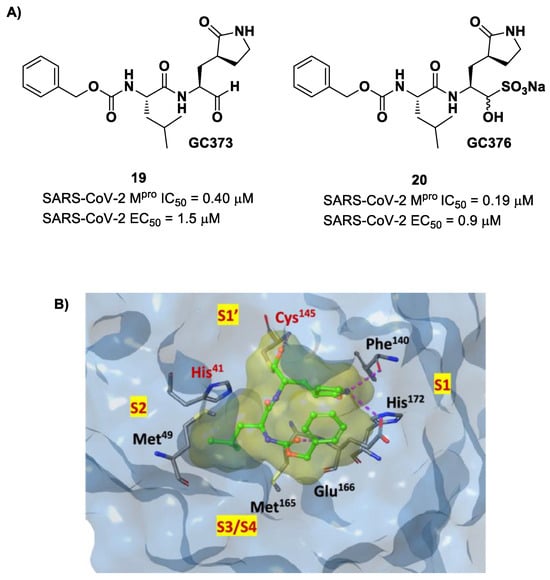 Other examples of aldehyde-based SARS-CoV-2 Mpro inhibitors are GC373 (i.e., compound 19 in Figure 13A) and its bisulfite prodrug GC376 (i.e., compound 20 in Figure 13A) [41]. These compounds were initially used to treat feline infectious peritonitis, caused by feline coronaviruses FCoV, and then they were repurposed as SARS-CoV-2 Mpro inhibitors. In both compounds, there is a benzyl moiety at P3, a leucine residue at P2 and a (S)-γ-lactam group at P1. Compounds 19 and 20 inhibited the activity of SARS-CoV-2 Mpro, with an IC50 value of 0.40 and 0.19 μM, respectively. The X-ray crystal structure of SARS-CoV-2 Mpro in complex with both compounds confirmed the ability of the prodrug 20 to provide the aldehyde function since they showed an identical binding mode: the aldehyde warhead reacted covalently with the Cys145 thiol group to give a hemithioacetal adduct that is stabilized by several H-bonds inside the oxyanionic hole with Cys145 (Figure 13B) [41]. The P1 γ-lactam moiety forms a H-bond with His163 and Glu166 and interacts with the main chain of Phe140, while the P2 leucine is inserted into the P2 pocket, establishing hydrophobic interactions with Met149, His41 and Met49. The benzyl group at P3 interacts with the S3/S4 superficial sites by means of hydrophobic interactions. Both compounds exhibited high in vitro antiviral activity observed in VeroE6 cell infected with SARS-CoV-2 (19: EC50 = 1.5 μM; 20: EC50 = 0.9 μM) and low cell toxicity (CC50 > 100 μM for both compounds). Nevertheless, the use of the bisulfite prodrug 20 has been preferred due to better outcomes in terms of bioavailability.
