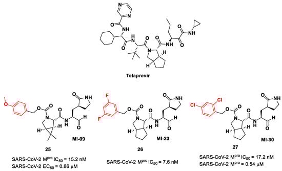 Another interesting approach was undertaken to enhance the interaction inside the S2 pocket. It involved the introduction of a bicyclic proline derivative, a motif present in the structure of two potent inhibitors of HCV protease, i.e., Boceprevir (Figure 9) and Telaprevir (Figure 16). In particular, the proline residue was fused with three- (Boceprevir) or five-membered (Telaprevir) carbocyclic rings to form constrained bicyclic synthons [45]. The most interesting compounds are depicted in Figure 16. The aldehyde derivative 25 (also MI-09 in Figure 16) contains the same P2 fragment extrapolated from Boceprevir and connected to a para-OMe benzyl carbamate functional group, while the aldehyde derivatives 26 and 27 (also MI-23 and MI-30, respectively, in Figure 16) are endowed with the P2 fragment of Telaprevir and variously halogenated benzyl carbamate moieties at P3 [45].