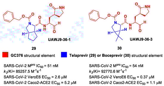 In parallel, Xia et al. designed and synthetized compounds 29 and 30 (Figure 19), called UAWJ9-36-1 and UAWJ9-36-3, respectively, by retaining the P2 bicyclic proline synthons found in Telaprevir and Boceprevir [47]. The insertion of a chemically modified bicyclic proline fragment represents a new interesting strategy in the development of recent anticoronavirus agents [48]. Compound 29 was designed as a hybrid form of GC376 and Telaprevir, whereas 30 was designed as a hybrid form of GC376 and Boceprevir.