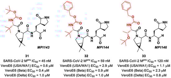 Other Boceprevir analogs with an aldehyde warhead at P1′ came from the work of Alugubelli et al. [49]. Among the 19 synthesized compounds, the most promising derivatives were compounds 31, 32 and 33 (Figure 21), called MPI43, MPI44 and MPI46, respectively, displaying high-potency in vitro and in cellulo assays with IC50 values in the range 45–120 nM (in vitro) and EC50 values in the range 0.14–0.31 µM (in cellulo) [49]. These compounds were also evaluated for their antiviral efficacy against VeroE6 cells infected with USA-WA1/2020 and beta and delta strains of SARS-CoV-2. Interestingly, these three compounds bear a P4 N-terminal carbamate moiety, which seems to be critical for high cellular and antiviral potency and low cytotoxicity [49].