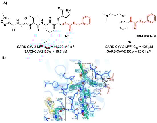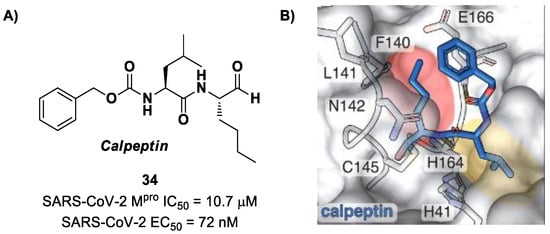 Another aldehyde-based compound was found by Günther et al. [50] using large-scale X-ray crystallography to screen a library of more than 5000 compounds among approved drugs or drugs in clinical trials. The selected compounds were then tested for their antiviral activity against SARS-CoV-2 in VeroE6 cells. Among them, Calpeptin (34 in Figure 22A) showed the highest antiviral activity, with an EC50 value of 72 nM and known enzymatic inhibitory activity (IC50 = 10.7 μM) [50,51]. This compound contains an aldehyde warhead at P1′, an n-Leu residue at P1, a Leu residue at P2 and a Boc group at P3. The X-ray crystal structure of SARS-CoV-2 Mpro in complex with 34 showed the standard thiohemiacetal covalent adduct Cys145/aldehyde warhead (Figure 22B). Compound 34 also inhibits cathepsin L, making it a good anti-COVID-19 drug candidate as a dual inhibitor [50].