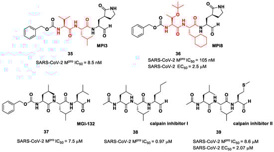 The aldehyde-based inhibitors discussed so far are dipeptidyl derivatives. However, there are some examples of notable tripeptidyl derivatives (Figure 23). Compounds 35 and 36, called MPI3 and MPI8, respectively, are the most active tripeptides designed and synthetized by Yang et al. [52]. Both compounds have the aldehyde warhead at P1′ and a (S)-γ-lactam group at P1. Compound 35 is endowed with l-Leu at P2 and a Cbz-protected l-Val at P3, while, in 36, we have a cyclohexyl ring at P2 and a Cbz-protected t-Bu Thr at P3. In the in vitro enzymatic inhibitory activity assay, 35 turned out to be the most active compound, displaying an IC50 value of 8.5 nM. Conversely, in the in vitro antiviral test, 35 turned out to be less active than 36 (EC50 = 2.5 μM in VeroE6 cells), probably due to the presence of all natural amino acids that can be hydrolyzed by cellular proteases [52]. Such a high potency could be related to the dual inhibition of SARS-Co-2 Mpro (IC50 = 105 nM) and cathepsin L (IC50 = 1.2 nM). This assumption led to consideration of the tripeptidyl proteasome inhibitor MGI-132 (compound 37 in Figure 23) [53] and calpain/cathepsin inhibitor I and II (compounds 38 and 39, respectively, in Figure 23) as potential SARS-CoV-2 Mpro inhibitors [43]. In vitro enzymatic inhibition and cell-based antiviral tests brought about interesting results, particularly for the calpain inhibitor II. This could represent an interesting starting point for the development of dual inhibitors of calpain/cathepsin and SARS-CoV-2 Mpro.