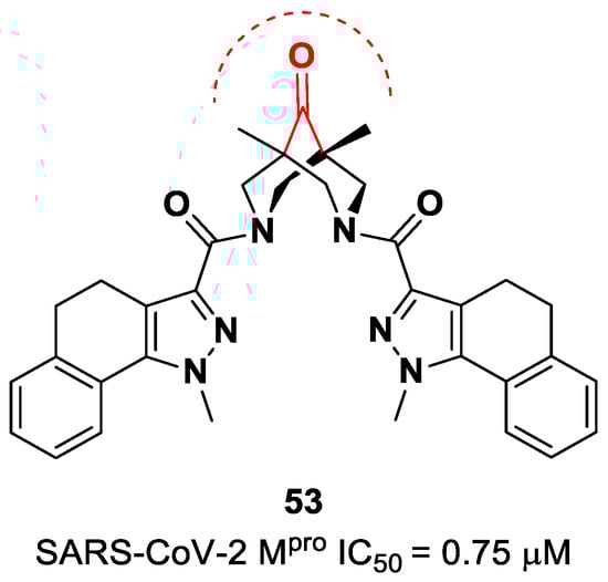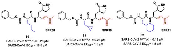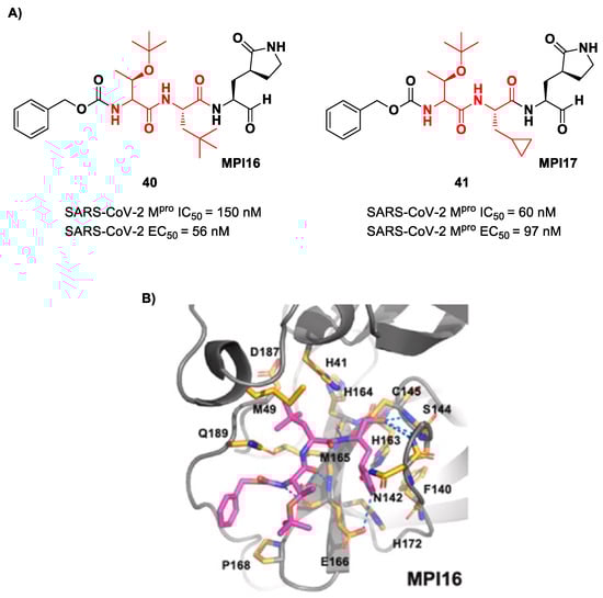 Ma et al. developed another series of tripeptidyl derivatives, maintaining the aldehyde warhead at P1′ and the (S)-γ-lactam group at P1 and then varying the chemical composition at both P2 and P3 positions [54]. The most interesting compounds were 40 and 41, also called MPI16 and MPI17 (Figure 24). At the P3 position, an O-t-butyl-Thr residue is present in both inhibitors, while, at P2, a t-butyl group and a cyclopropyl ring are in 40 and 41, respectively. These compounds showed excellent enzymatic inhibitory activity (40: IC50 = 150 nM; 41: IC50 = 60 nM), high potency in the cell-based assays (40: EC50 = 56 nM; 41: EC50 = 97 nM) and high antiviral activity against different variants of SARS-CoV-2, suggesting that the O-t-butyl-Thr residue at P3 can be a key structural element for future design. From the X-ray structure of the SARS-CoV-2 Mpro in complex with 40, it emerged that the O-t-butyl-Thr residue may furnish supplementary Van der Waals interactions with Pro168 and Glu166 [54].