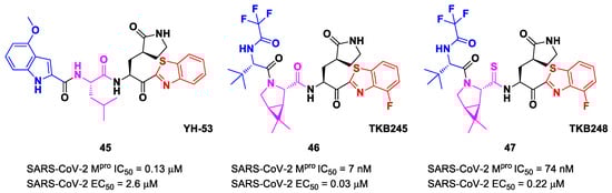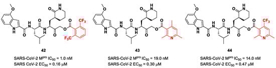 Taking into consideration the structures of the already published SARS-CoV-2 inhibitors PF-00835231 and GC-376, Bai et al. explored different α-acyloxymethyl ketones bearing a six-membered lactam moiety at P1 in order to mimic the Gln residue [58]. The most promising compounds turned out to be 42, 43 and 44 (Figure 25), which bear a 2,6-bis(trifluoro)methylbenzoate, 2,4,6-trimethylnicotinate and 4-trifluoromethyl-2,6-dimethylnicotinate fragment as the C-terminal α-acyloxy moiety, respectively.