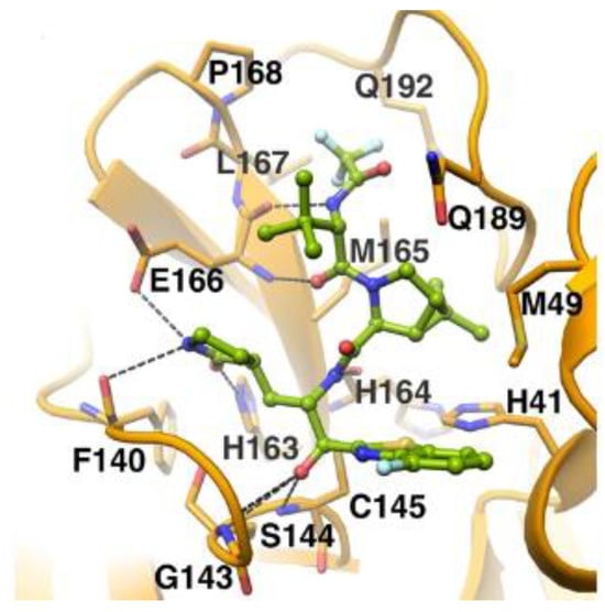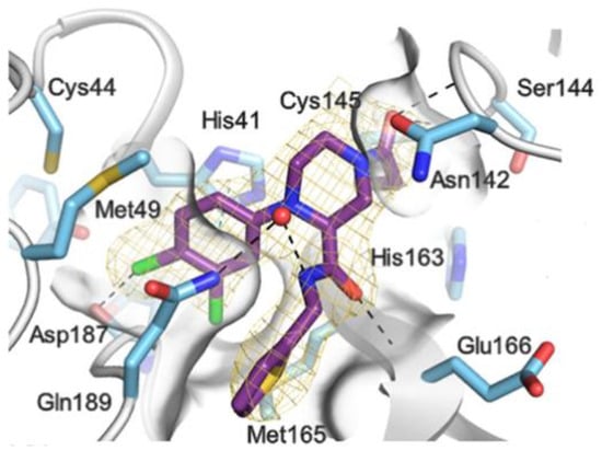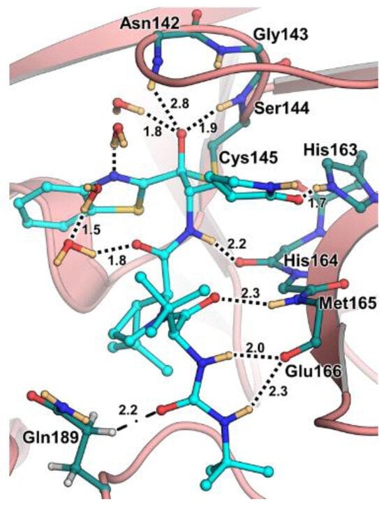 The co-crystal structure of Nirmatrelvir with SARS-CoV-2 Mpro clarified its mechanism of action. The nitrile warhead in P1′ forms a reversible covalent bond with Cys145 at S1′, with the formation of the thioimidate adduct that establishes a H-bond with the Gly143 residue. The γ-lactam moiety interacts with His163 and Glu166 in the S1 pocket, while the aliphatic dimethyl-bicycloproline fits inside the S2 pocket via the formation of several van der Waals interactions with the surrounding apolar residues. Moreover, the carbonyl oxygen of the trifluoromethyl acetamide acts as a H-bond acceptor toward the Gln189 residue, while the trifluoromethyl group establishes interactions with the S4 pocket (Figure 6) [17].