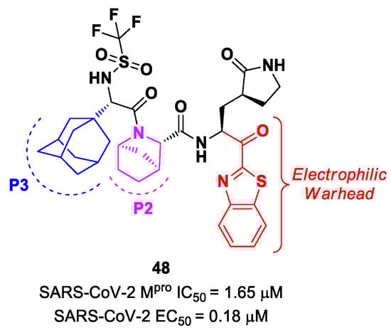 Another example of the GC376 derivative emerged from a study based on activity-guide optimization [46]. Compound 28 (Figure 18) is a novel dipeptidyl structure, bearing a constrained bicyclic ring in the P3 position. This compound exhibited an inhibitory activity against SARS-CoV-2 Mpro in the micromolar range (IC50 = 0.18 μM) and antiviral activity in the sub-micromolar range (EC50 = 0.035 μM; VeroE6 infected cells).