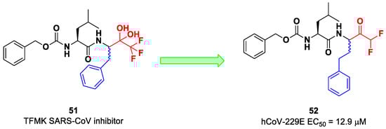 - Citarella, A.; Gentile, D.; Rescifina, A.; Piperno, A.; Mognetti, B.; Gribaudo, G.; Sciortino, M.T.; Holzer, W.; Pace, V.; Micale, N. Pseudo-Dipeptide Bearing α,α-Difluoromethyl Ketone Moiety as Electrophilic Warhead with Activity against Coronaviruses. Int. J. Mol. Sci. 2021, 22, 1398. [Google Scholar] [CrossRef] [PubMed]