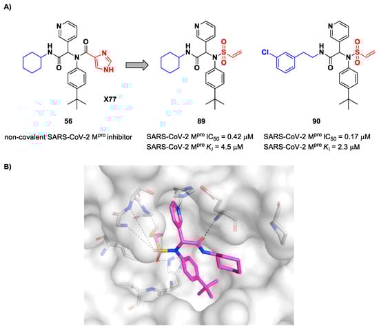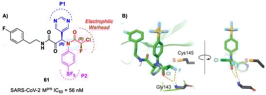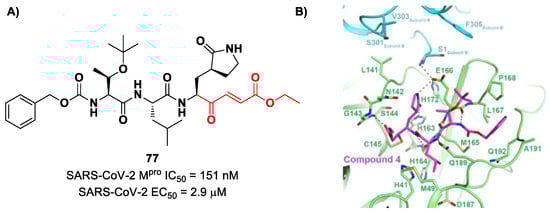 Structural modifications of 20 were conducted in order to improve the in vitro antiviral activity against SARS-CoV-2 [41]. Specifically, its P2 position was redesigned by substituting the leucine side chain with a constrained cyclopropylmethyl ring, while its benzyl group at P3 was decorated with a meta-F substituent (i.e., compound 21 in Figure 14A) or elongated with a supplementary methylene group that connects a 3-chlorophenyl ring to the carbamate linkage (i.e., compound 22 in Figure 14A) [42]. Both compounds displayed improved in vitro inhibitory activity against Mpro as well as antiviral activity in comparison to the lead (21: IC50 = 0.07 and EC50 = 0.57 μM; 22: IC50 = 0.08 μM and EC50 = 0.7 μM) [42]. The X-ray structure of the complex between Mpro and 21 indicated that the P2 cyclopropyl fragment is able to fit more deeply within the S2 subsite, while the substitution at P3 with a halogenated phenyl ring allowed the inhibitor to fit the S3/S4 pocket more deeply instead of remaining on the surface of the protease (Figure 14B) [42].