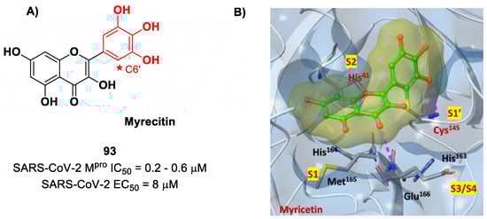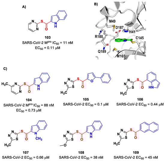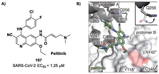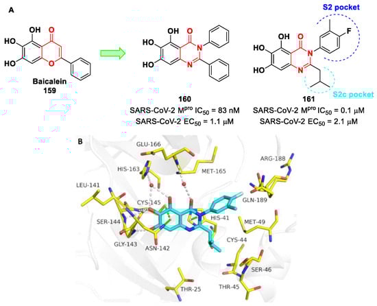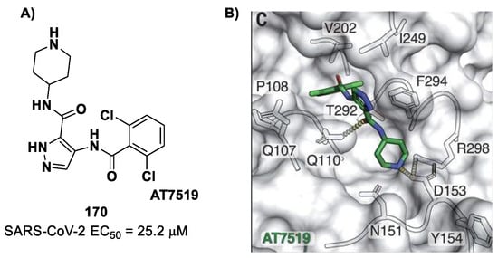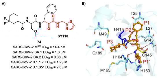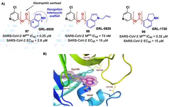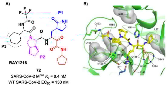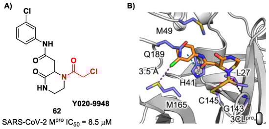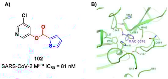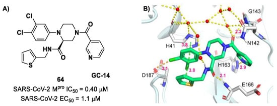 (A) Chemical structure and biological activity of compound 34; (B) X-ray structure of SARS-CoV-2 Mpro in complex with 34 (PDB: 7AKU).