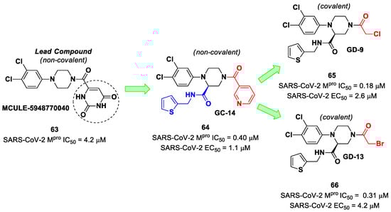 - Gao, S.; Song, L.; Claff, T.; Woodson, M.; Sylvester, K.; Jing, L.; Weiße, R.H.; Cheng, Y.; Sträter, N.; Schäkel, L.; et al. Discovery and Crystallographic Studies of Nonpeptidic Piperazine Derivatives as Covalent SARS-CoV-2 Main Protease Inhibitors. J. Med. Chem. 2022, 65, 16902–16917. [Google Scholar] [CrossRef] [PubMed]