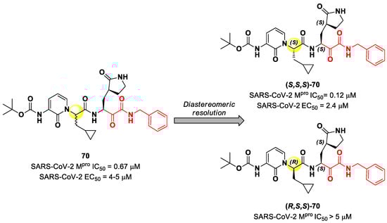 - Cooper, M.S.; Zhang, L.; Ibrahim, M.; Zhang, K.; Sun, X.; Röske, J.; Göhl, M.; Brönstrup, M.; Cowell, J.K.; Sauerhering, L.; et al. Diastereomeric Resolution Yields Highly Potent Inhibitor of SARS-CoV-2 Main Protease. J. Med. Chem. 2022, 65, 13328–13342. [Google Scholar] [CrossRef] [PubMed]