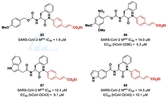 - Citarella, A.; Moi, D.; Pedrini, M.; Pérez-Peña, H.; Pieraccini, S.; Dimasi, A.; Stagno, C.; Micale, N.; Schirmeister, T.; Sibille, G.; et al. Synthesis of SARS-CoV-2 Mpro Inhibitors Bearing a Cinnamic Ester Warhead with in Vitro Activity against Human Coronaviruses. Org. Biomol. Chem. 2023, 21, 3811–3824. [Google Scholar] [CrossRef] [PubMed]