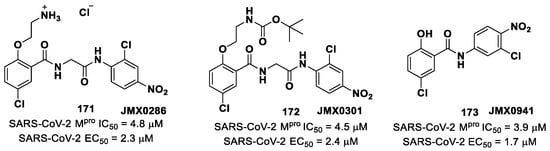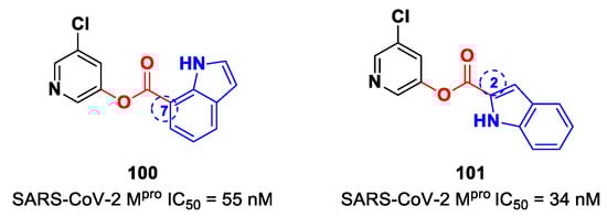 The success of the nitrile warhead on Nirmatrelvir led Pfizer scientists to investigate other nitrile-based compounds as inhibitors of SARS-CoV-2 Mpro, resumed in a new patent published on 16 December 2021, identifying compound 8 (Figure 7) as a new SARS-CoV-2 Mpro inhibitor (Ki = 4 nM; EC50 = 19 nM) [32]. Bai et al. explored other nitrile analogs, investigating the 4-methoxyindole moiety at P3 [33]. Among all products, compound 9 (Figure 7), having a 6-chloro-4-methyloxyindole function at P3, showed the best results in terms of in vitro enzymatic inhibitory and antiviral activity (IC50 = 9 nM; EC50 = 2.2 μM) [25].