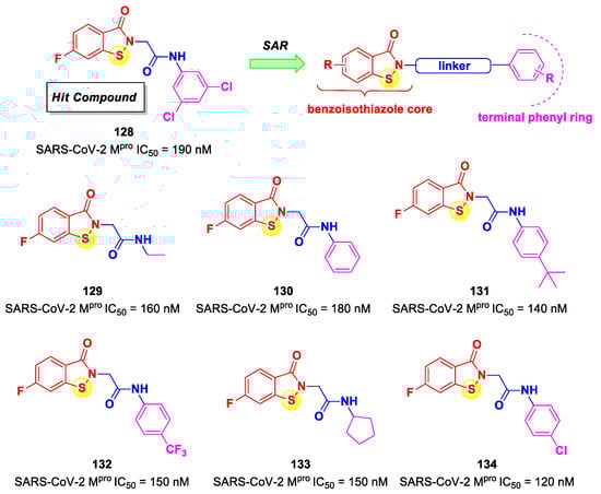 - Chen, W.; Feng, B.; Han, S.; Wang, P.; Chen, W.; Zang, Y.; Li, J.; Hu, Y. Discovery of Highly Potent SARS-CoV-2 Mpro Inhibitors Based on Benzoisothiazolone Scaffold. Bioorg. Med. Chem. Lett. 2022, 58, 128526. [Google Scholar] [CrossRef]