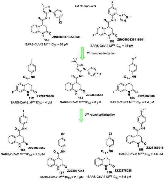 - Han, S.H.; Goins, C.M.; Arya, T.; Shin, W.J.; Maw, J.; Hooper, A.; Sonawane, D.P.; Porter, M.R.; Bannister, B.E.; Crouch, R.D.; et al. Structure-Based Optimization of ML300-Derived, Noncovalent Inhibitors Targeting the Severe Acute Respiratory Syndrome Coronavirus 3CL Protease (SARS-CoV-2 3CLpro). J. Med. Chem. 2022, 65, 2880–2904. [Google Scholar] [CrossRef] [PubMed]