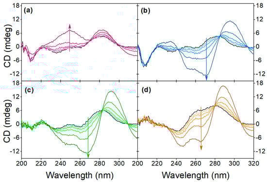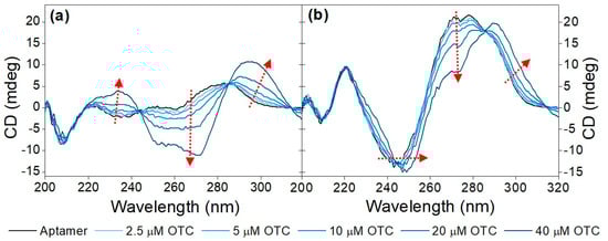 Initially, the CD spectra of the variable region of the aptamer including the primers flanking it (71-base-long) and without them (40-base-long) were recorded in the absence as well as in the presence of increasing OTC concentrations (Figure 1). As both sequences contain a high number of guanine bases, it was anticipated that they assume a guanine quadruplex (G-quadruplex) structure. G-quadruplexes are made up of multiple G-quartets, planar square motifs formed by four guanine bases. G-quadruplexes can be categorized into three main subtypes: parallel, antiparallel and hybrid [20,21,36,37]. Parallel G-quadruplexes can be identified by their large positive peak at 260 nm, and a shallow negative one at 240 nm. Antiparallel G-quadruplexes, on the other hand, display a negative peak at 260 nm and a positive peak at around 295 nm, while the peaks of the hybrid structures fall between the peaks of the previous two, showing positive peaks at 295 nm and 260 nm, as well as a negative one at 240 nm. These wavelength values are averages of the values reported in the literature; the exact values where peaks are formed are influenced by differences in G-quartet stacking, strand segment orientation and loop arrangements [38]. This shows the ambiguity when interpreting CD spectra of G-quadruplex structures.