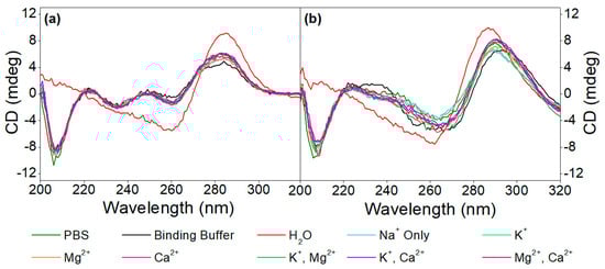 Subsequently, the effect of different cations (K+, Mg2+, Ca2+ or combinations thereof) on the aptamer structures, as well as on the target-induced conformational changes, was examined in different media, as seen in Figure 2. The CD spectra of the 40-mer aptamer recorded in the absence of the analyte revealed that they conform to the same structure, irrespective of the ionic composition or strength of the buffer, which also holds true for the buffering media employed, while in the complete absence of ions (i.e., in pure H2O), different conformation was observed. In other words, the aptamer folds into its respective structure simply in the presence of monovalent cations, while divalent cations do not significantly influence this structure, which is not the case with other G-quadruplex conforming aptamers, whereby the presence of divalent cations is of paramount importance for their folding [21,39]. Nonetheless, when the buffer used during the SELEX process is employed, and therefore the aptamer is in the presence of both monovalent (Na+ and K+) as well as divalent cations (Mg2+ and Ca2+), the CD spectra recorded show similar shifts to those induced by the analyte itself, unlike in pure H2O. This is why the binding buffer was employed in all subsequent experiments.