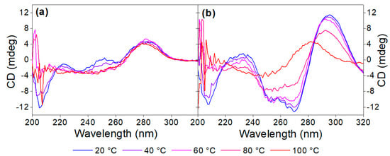 Denaturation of (a) 5 µM aptamer and (b) 5 µM aptamer in the presence of 40 µM OTC in Tris binding buffer pH = 7.1.