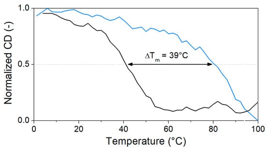Normalized CD change in characteristic peaks of unbound (black, 250 nm) and OTC-bound (blue, 270 nm) aptamers through the denaturation process (5 µM aptamer and 40 µM OTC in Tris binding buffer pH = 7.1).