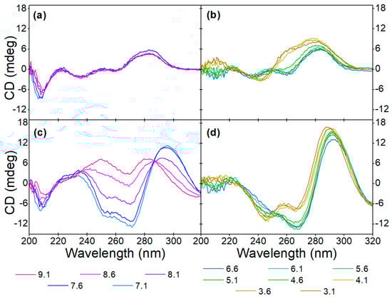 In the acidic pH range (Figure 5b,d), however, the unbound aptamer shows different behavior. When the pH is below 4.6, a negative peak at 240 nm and a positive peak at 260 nm appears, and the positive peak at 290 nm increases in intensity. According to the literature, this is due to the protonation of cytosine bases [51]. This structure, contrary to observations in alkaline conditions, seems to be undisturbed by the OTC interaction, i.e., the deviations from the CD spectra of the OTC-bound aptamer at pHs higher than 4.1 at the wavelengths of 240 nm, 260 nm and 290 nm remain the same. While the CD spectra of the native aptamer in the acidic pH resemble hybrid G-quadruplex conformation, the fact that the pH-induced structure is unaffected by the OTC addition suggests that this structure is most likely in a different part of the DNA strand than the sequence responsible for OTC binding.