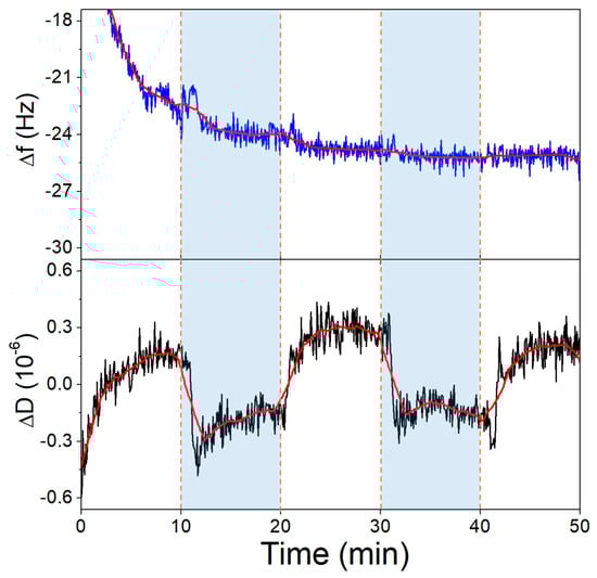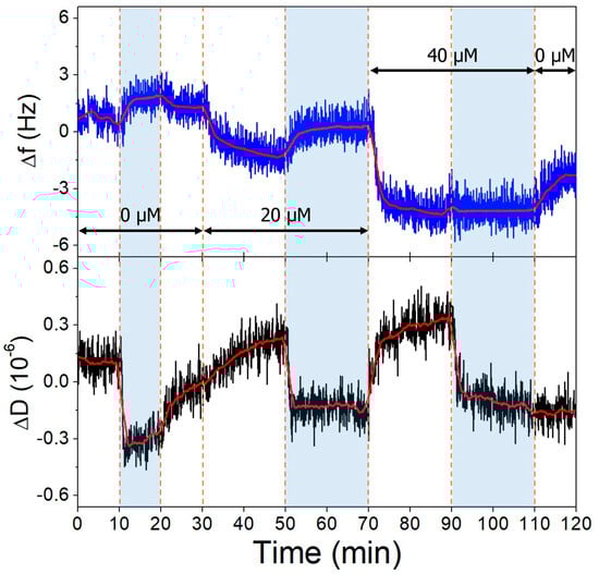 The third overtone frequency (top) and dissipation (bottom) variation values of the aptamer-modified gold surface in response to pH change. Dashed lines indicate solution changes, with white background corresponding to pH 6.6 and blue to pH 3.6.
