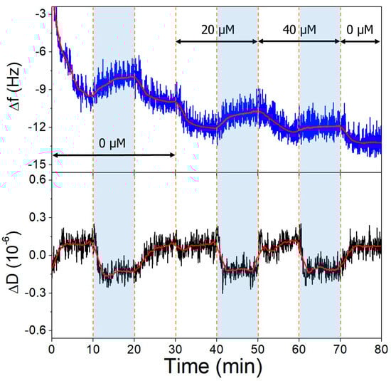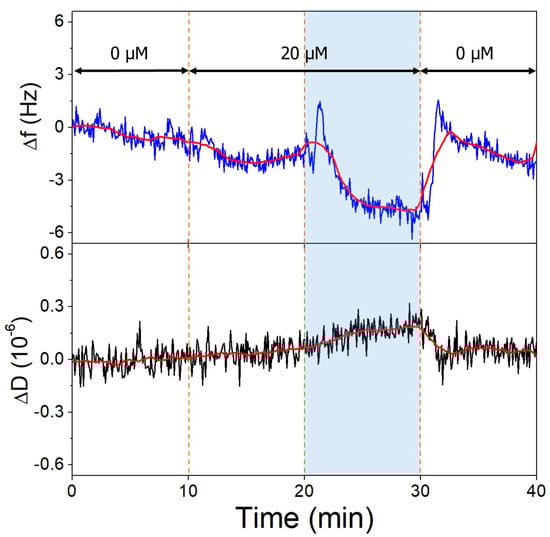 The QCM with an impedance analysis (QCM-I) unit (MicroVacuum Ltd., Budapest, Hungary) was controlled via BioSense 3 software (MicroVacuum Ltd., Budapest, Hungary. The QCM-I device’s resonance and dissipation sensitivity in liquid are 0.2 Hz and 1 × 10−7, respectively. Solutions were drawn through the QCM fluidic cell using an Ismatec peristaltic pump at 60 µL/min. To change solutions, the pump was stopped for a moment, the tubing was immersed into the next solution and the pump was started again. The cell temperature was thermostated to 25 °C. Besides the fundamental resonance frequency, dissipation was also registered at odd-numbered overtones up to the 13th.