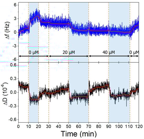First, we investigated the pH-induced conformational change of the surface-bound aptamer, where the thiolated 40-mer aptamer was deposited on the gold surface of the QCR and SSC buffer of pH 6.6 and pH 3.6 were exchanged over it, repeatedly. In Figure 7, it is shown that the dissipation decreases as the pH is lowered, which corresponds to the aptamer layer becoming more compact. Cytosine-rich sequences form a dense quadruplex structure called an i-motif in acidic pH due to the deprotonation of the bases. The formation of such a conformation explains both the CD (Figure 5b) and the QCM results. Supporting QCM results are already published regarding i-motif formation [52]. The frequency of the crystal during this measurement did not change due to differences in pH.