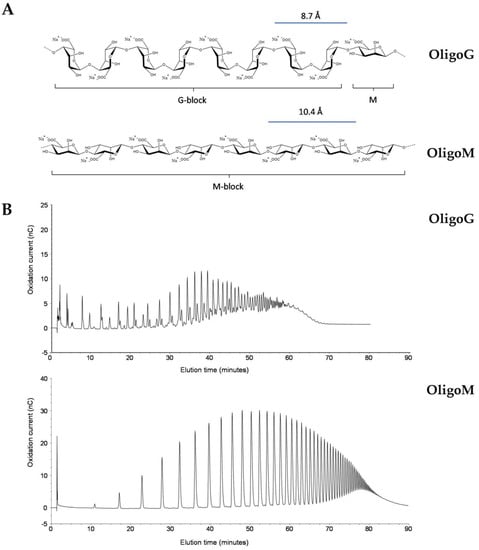 The OligoG alginate oligosaccharide had >85% monomer residues of G-units. OligoM had 100% monomer residues of M-units (Figure 1A). Purified OligoG and OligoM were characterized by high-performance anion-exchange chromatography with pulsed amperometric detection (HPAEC-PAD; Figure 1B).
