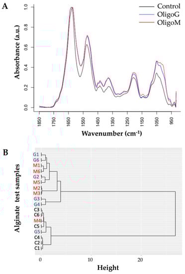Data processing and analysis were performed using the R statistical environment [22]; wavenumbers from 1850 to 950 cm−1 were pre-processed using two-point liner subtraction baseline correction methods and then normalized using vector normalization. The Wilcox Rank Sum test was used to determine wavenumbers that were significantly different (p < 0.05) between the OligoG and OligoM spectra. To compensate for multiple testing, Bonferroni correction was applied. These selected wavenumbers were put forward into hierarchical cluster analysis (HCA), and a dendrogram produced.