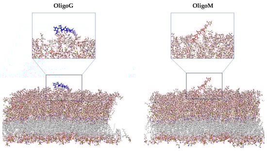 MD simulations of G- and M-blocks (DP 6) with the LPS-DPPE bilayer membrane of P. aeruginosa (measuring ~6 nm in thickness) in the presence of calcium were conducted over 300 ns. The simulations suggested that G-block alginates were attracted to the LPS bilayer within the first few nanoseconds (ns). This occurred through strong hydrogen bond interactions, thus breaking existing hydrogen bonds between sugar groups and/or preventing LPS from forming bonding with water molecules (Supplementary Materials Figure S1). These findings were aided by the strong attraction between the G residues and Ca2+ ions, overcoming the electrostatic repulsion between the large negative charge of both the oligomer and LPS (Figure 3). The G-block subsequently detached and re-attached to the LPS molecules several times with an increasing number of hydrogen bonds (maximum of 20 at 203 ns), simultaneously dislodging three Ca2+ ions from the membrane. This occurred at ~4 ns, ~80 ns, and ~150 ns (which began at 22 nm, 46 nm, and 60 nm from the G-block, respectively). Subsequently, the first two Ca2+ ions remained within 0.3 nm of the G-block residues. The G-block molecule penetrated the bacterial membrane approximately 1.6–1.8 nm before the simulation reached the halfway point, forming hydrogen bonds with WLL (2-(2-L-alanyl)-2-deoxy-D-galactosamine) or PO4 (phosphate) groups within the LPS molecule (Supplementary Materials Figure S1). In contrast, MD simulations with M-block alginates revealed hydrogen bonding between the oligomer and the LPS, which did not extend as far into the membrane as that observed for the G-block structures (Figure 3). The M-block also demonstrated significantly less movement/binding of Ca2+ ions, with one Ca2+ ion leaving the LPS bilayer at a more advanced stage (~100 ns).