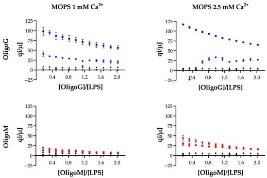 Interaction between OligoG (blue) or OligoM (red) and pseudomonal LPS. Heat effects per injection (qi) for the titration of 20 mg/mL alginate oligosaccharide into 10 mg/mL LPS (□), 20 mg/mL alginate oligosaccharide into buffer (○), buffer into 10 mg/mL LPS (Δ), and buffer-into-buffer (∇) at 37 °C. Buffer: 100 mM NaCl and 20 mM MOPS (+ NaOH adjusted to pH 7) with CaCl2 (1 mM or 2.5 mM final free Ca2+).