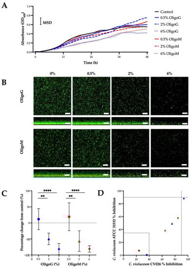 The dose-dependent reduction in bacterial growth was evident during exponential growth for both OligoG and OligoM (Figure 5A), which was significant at 6% between 16 and 40 h compared to the untreated control (MSD = 0.11). At stationary phase (where the line graph plateaus) this effect was lost, although both 6% OligoG and OligoM continued to demonstrate reduced growth.