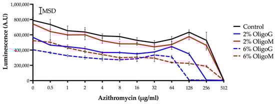 The effect of OligoG and OligoM (0–6%) on antibiotic potentiation of the macrolide azithromycin was studied [31] using standard MIC broth microdilution assays as previously described [13].