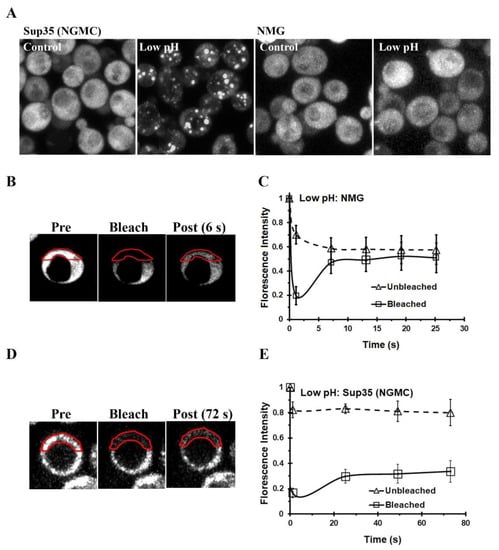 Acidification of the intracellular cytosol by energy depletion causes phase separation of Sup35, but not the NM domains of Sup35. (A) Maximized Z-stack confocal images of yeast expressing either Sup35 (NGMC) or NM-GFP (NMG) were taken before energy depletion and 75 min after energy depletion. (B) Images of energy-depleted yeast expressing NMG before photobleaching, directly after photobleaching, and following photobleaching of energy-depleted yeast. The red line indicates the bleached region in the yeast cell. (C) Plot of the change in fluorescence intensity of NMG following photobleaching of energy-depleted yeast. The intensity was measured both in bleached and unbleached regions as a function of time. The data were normalized to obtain an average and standard deviation (n = 5). (D) Images of energy-depleted yeast expressing Sup35 (NGMC) before photobleaching, directly after photobleaching, and 72 s following photobleaching. (E) Plot of the change in fluorescence intensity of NGMC following photobleaching of energy-depleted yeast. The intensity was measured both in bleached and unbleached regions as a function of time. The data were normalized to obtain an average and standard deviation (n = 5).