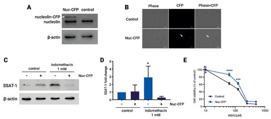 To investigate the causal relationship between the effects of indomethacin, the increase in SSAT-1 levels, and the levels of nucleolin, we conducted an overexpression experiment of the nucleolin protein in H1299 cells using a nucleolin-CFP (cyan fluorescent protein) system. The overexpression of the protein was confirmed through immunoblotting, where the nucleolin antibody identified two bands: one corresponding to the native nucleolin and the other, with a higher molecular weight, corresponding to the nucleolin tagged with CFP (Figure 4A). Additionally, fluorescence microscopy was performed to visualize the fluorescence emitted by the CFP tag in the transfected cells (Figure 4B). Interestingly, the cells overexpressing the nucleolin-CFP protein did not exhibit an increase in SSAT-1 levels upon indomethacin treatment (Figure 4C,D). Moreover, the impact of indomethacin on cell viability was partially but significantly reversed in the cells overexpressing the nucleolin-CFP protein (Figure 4E).