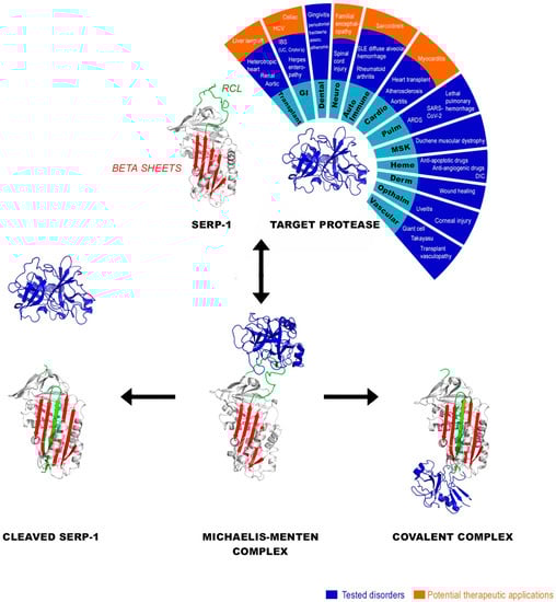- Mahon, B.; Ambadapadi, S.; Yaron, J.; Lomelino, C.; Pinard, M.; Keinan, S.; Kurnikov, I.; Macaulay, C.; Zhang, L.; Reeves, W.; et al. Crystal structure of Serp-1, a Myxomavirus-derived immune modulating Serpin; structural design of Serpin reactive center loop (RCL) peptides with improved therapeutic function. Biochemistry 2018, 57, 1096–1107. [Google Scholar] [CrossRef] [PubMed]