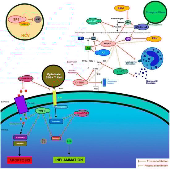 - Dai, E.; Guan, H.; Liu, L.; Little, S.; McFadden, G.; Vaziri, S.; Cao, H.; Ivanova, I.; Bocksch, L.; Lucas, A. Serp-1, a Viral Anti-inflammatory Serpin, Regulates Cellular Serine Proteinase and Serpin Responses to Vascular Injury. J. Biol. Chem. 2003, 278, 18563–18572. [Google Scholar] [CrossRef] [PubMed]