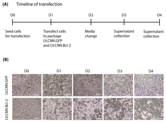 Figure 1. Vector titre was reduced by Bcl-2 transgene expression during lentivirus packaging. (A) Timeline of transfection protocol for lentivirus packaging. HEK293T cells were transfected in T150 flasks by calcium phosphate precipitation and monitored after transfection on day 1. (B) Cells were imaged daily from D0 to D4 (scale bar = 200 mm).