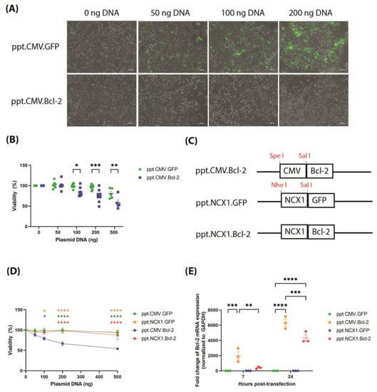HEK293T cells were seeded at 5 × 105 cells/well in 24-well plates. Twenty-four hours later (D1), cells were transfected with lentiviral plasmids (ppt.CMV.GFP, ppt.CMV.Bcl-2, ppt.NCX1.GFP or ppt.NCX1.Bcl-2) at 0, 50, 100, 200 and 500 ng. Media were changed on D2, followed by MTT assay on day 4. Cell viability was assessed on D3 using the CellTiter 96® Non-Radioactive Cell Proliferation Assay (Promega, #G4000, Madison, WI, USA), hereafter abbreviated to “MTT assay”, according to the manufacturer’s instructions.