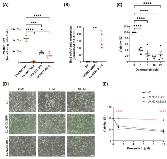 Figure 3. Reduced Bcl-2-mediated toxicity improved packaging efficiency, and resulted in production of function Bcl-2-encoding lentiviral vector. (A) Titre of lentiviral vectors quantified by qPCR from genomic DNA of transduced HEK293T cells. Statistical significance of differences was calculated using an ordinary one-way ANOVA, and the difference was calculated with Tukey’s multiple comparison test. (B) Bcl-2 expression in transfected NRVMs measured by qPCR (n = 3 per group). Data are normalised to GAPDH and expressed as fold change over NT. Statistical significance of differences was calculated using an ordinary one-way ANOVA, and the difference was calculated with Dunnett’s comparison. (C) Titration of doxorubicin in NRVMs 0–20 μM, with viability of cells assessed by MTT assay. Data expressed as a percentage of the untreated control. Statistical significance of differences was calculated using an ordinary one-way ANOVA, and the difference was calculated with Dunnett’s comparison. (D) Transduced cells in 24-well plates were treated with doxorubicin for 48 h at day 4 post transduction (n = 3). Fluorescence images showing merged GFP fluorescence and brightfield in live cells (scale bar = 100 mm). (E) Viability was then assessed using the MTT assay, with viability expressed as a percentage of the non-injured control (0 µM doxorubicin) of each group. Statistical significance of differences was calculated using a two-way ANOVA with Dunnett’s multiple comparison test (* p ≤ 0.05, ** p ≤ 0.01, *** p ≤ 0.001, **** p ≤ 0.0001). All data are mean ± SEM.