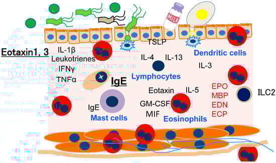 Factors related to the pathogenesis of non-EoE-EGID have yet to be fully elucidated. It has been reported that family members of EoE patients have an increased risk of developing non-EoE-EGID as well as EoE, and it is speculated that the two diseases have similar genetic backgrounds. Furthermore, 10–30% of non-EoE-EGID patients also develop pathological esophageal eosinophil infiltration [2]. Indeed, transcriptome analysis findings have indicated some similarities of EoE with eosinophilic gastritis, while the similarity between EoE and eosinophilic colitis is limited [3,4]; the research results suggest a similar pathogenesis for non-EoE-EGID and EoE, and also indicate, in part, that the heterogeneity of the pathogenesis of non-EoE-EGID is dependent on the involved gastrointestinal segments. Eotaxin 3 is elevated in both EoE and eosinophilic gastritis, while eotaxin 1 is elevated in eosinophilic colitis. Allergen modifications caused by digestive enzymes and the gut microbiome as well as bioactive substances produced by the gut microbiome are also related to the complexity of non-EoE-EGID (Figure 2) [13]. Further research is necessary to understand the full pathogenesis of non-EoE-EGID cases.