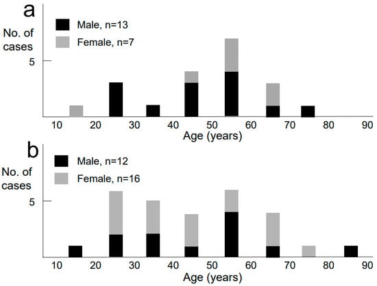 Case series of 28 non-EoE-EGID and 20 EoE patients. Age and gender distribution for: (a) EoE and (b) non-EoE-EGID. Patients with EoE were mainly in their 40s and 50s, with a male preponderance. Patients with non-EoE-EGID had a wider age range with a female preponderance.
