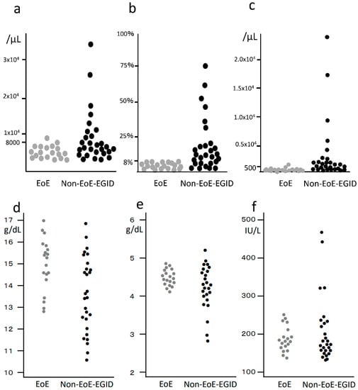 Case series of 28 non-EoE-EGID and 20 EoE patients: (a) Peripheral blood leucocyte count; (b) eosinophil fraction in leucocytes; (c) absolute eosinophil count. Elevated numbers of leucocytes and eosinophils were more frequently found in the non-EoE-EGID cases, with 68% of the non-EoE-EGID cases showing an elevated peripheral eosinophil count as compared to only 10% of the EoE cases; (d) peripheral blood hemoglobin concentration; (e) serum albumin; (f) LDH in EoE and non-EoE-EGID patients. Some of the non-EoE-EGID cases showed decreased hemoglobin and albumin concentrations, and increased LDH level, while, with respect to these measurements, there were no abnormal values among the EoE cases.
