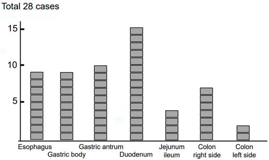 Case series of 28 non-EoE-EGID patients. Gastrointestinal tract involvement with eosinophilic inflammation was noted in patients with non-EoE-EGID. When more than two lesions were found in a single patient, each of the involved gastrointestinal segments was counted. The duodenum was the most frequently involved segment in non-EoE-EGID cases.