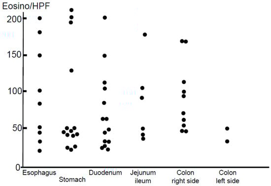 Peak eosinophil counts identified in an HPF (×400) as part of histopathological examinations are shown in Figure 6. Eosinophils infiltrating each involved mucosal segment are shown as dots. However, cut-off levels for a diagnosis of non-EoE-EGID have yet to be unanimously determined by gastrointestinal pathology specialists. Therefore, we used cut-off levels for a diagnosis of EGID that were based on findings of our previous investigation of normal eosinophil infiltration levels in a large number of healthy Japanese adults, as follows: >15 in the esophagus, >20 in the stomach and duodenum, >30 in the small intestine, >50 in the right-side colon, and >30 in the left-side colon [30]. This study is the only available study investigating the normal cut-off level of gastrointestinal mucosal eosinophil infiltration in Japanese normal adults [30].