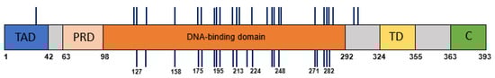 The distribution of mutations across TP53 gene domains. The mutations identified in HNSCC tumor DNA are represented by vertical lines above the TP53 gene domains’ illustration. The mutations detected in the plasma samples are depicted below the illustration. Codon numbers are indicated. Abbreviations: TAD, transactivation domain; PRD, proline-rich domain; TD, tetramerization domain; C, C terminus.