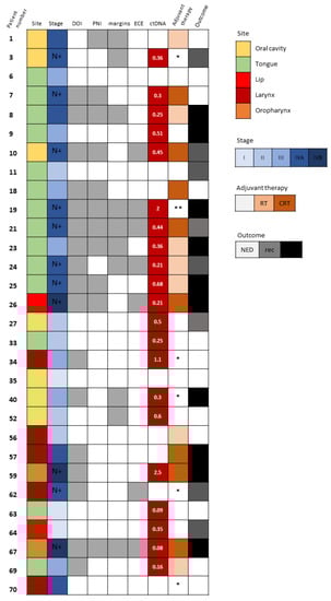 Tumor-specific TP53 mutation detection in circulating cell-free DNA. Description of clinical and pathological characteristics of 30 HNSCC patients whose matched plasma DNA was scrutinized for the detection of ctDNA based upon the identification of the tumor-specific TP53 mutation. Site and stage of disease are depicted. N+ denotes patients with N stage ≥ 1. The existence of DOI >10 mm, PNI and close (<5 mm) surgical margins are marked with gray boxes. Levels of detected ctDNA (allele frequency, %) are noted. Adjuvant therapy administered and survival outcomes at last follow-up are shown. In white, NED, no evidence of disease; in gray, recurrence (rec); and in black, disease progression and death. Abbreviations: DOI, depth of invasion; PNI, perineural invasion; ECE, extracapsular extension; ctDNA, circulating tumor DNA; RT, radiotherapy; CRT, chemoradiotherapy. * Not suitable for/refused adjuvant therapy. ** Rapidly progressed before administration of adjuvant therapy.